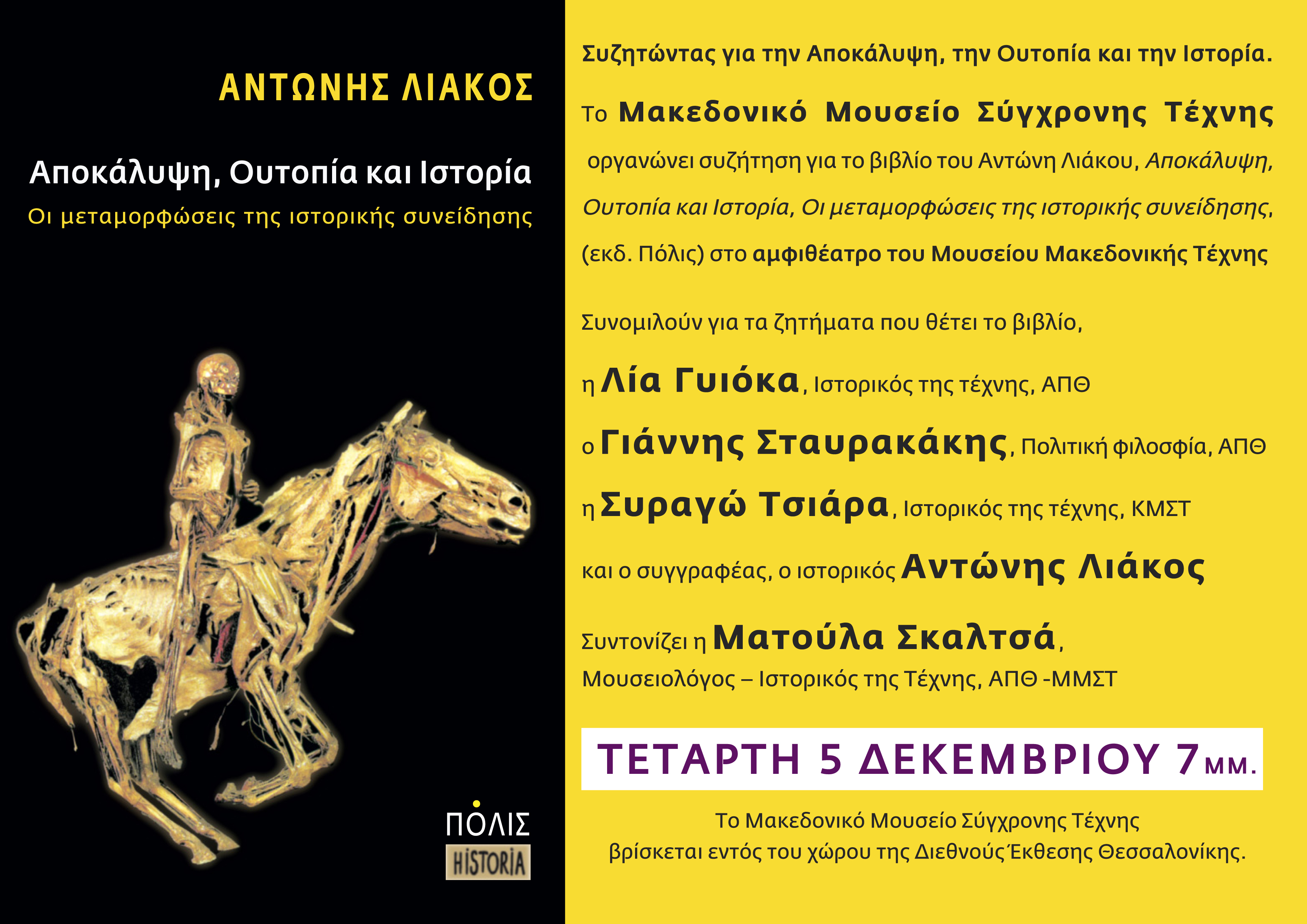 Το Μακεδονικό Μουσείο Σύγχρονης Τέχνης οργανώνει συζήτηση για το βιβλίο του Αντώνη Λιάκου, Αποκάλυψη, Ουτοπία και Ιστορία, Οι μεταμορφώσεις της ιστορικής συνείδησης, (εκδ. Πόλις) στο αμφιθέατρο του Μουσείου Μακεδονικής Τέχνης την Τετάρτη 5 Δεκεμβρίου 7 μ.μ.
